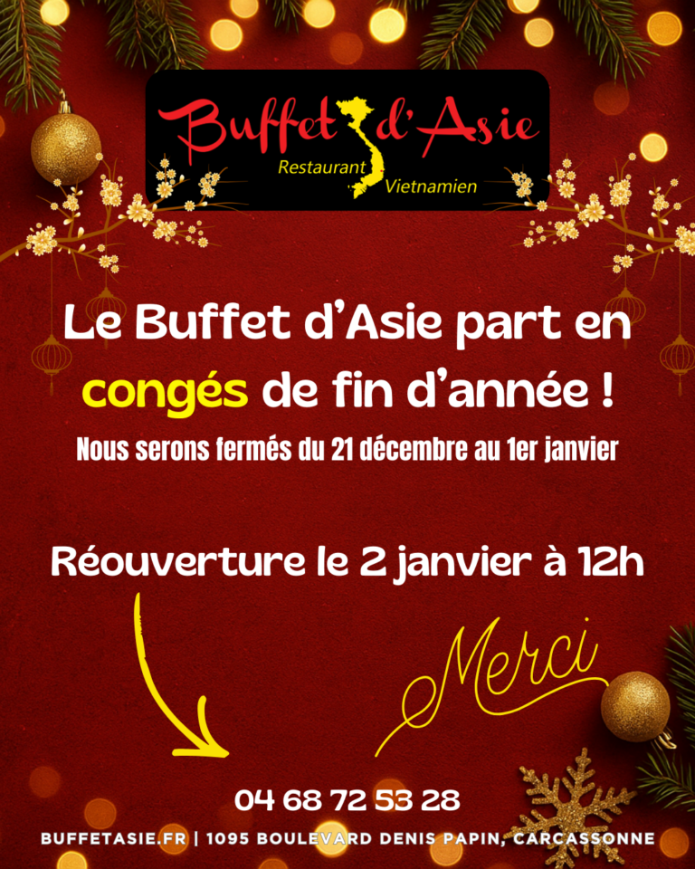 Ouvert du mardi au Samedi à Carcassonne , notre buffet restaurant vietnamien le Buffet d’Asie vous propose de savourer à volonté les délices de la cuisine asiatique dans un cadre privilégié.